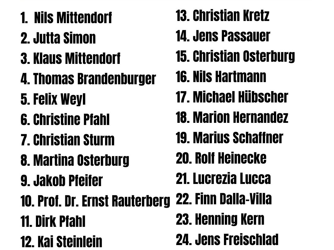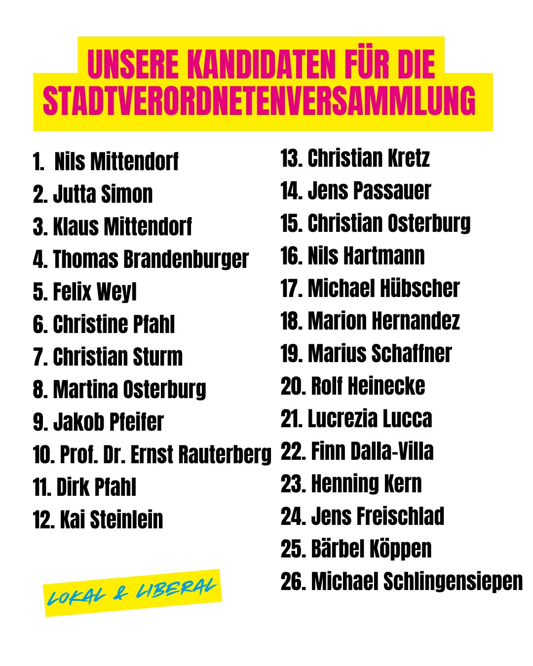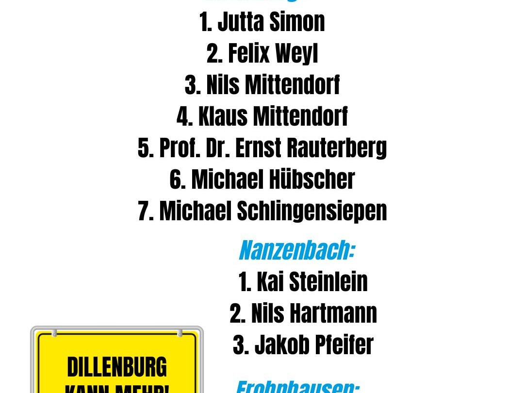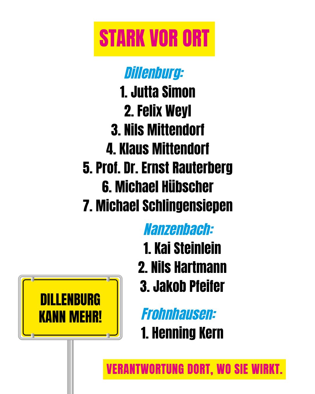 Für die Wahl zur Stadtverordnetenversammlung Dillenburg treten die Freien Demokraten mit folgender Liste an: